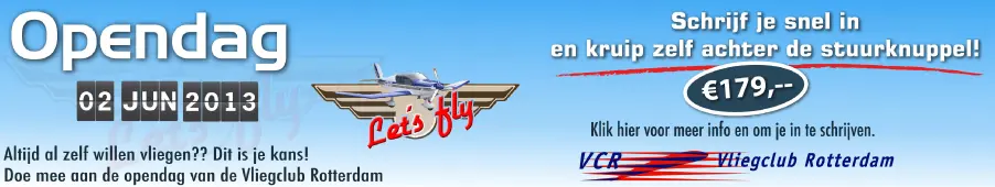 Op zondag 2 juni 2013 opent de Vliegclub Rotterdam (VCR) haar deuren op Rotterdam-The Hague Airport voor iedereen die altijd al een kijkje op de vliegclub wilde nemen en een keertje wilde vliegen. Voor deelname aan het speciale dagprogramma van de Open Dag, waarin o.a. de eerste vliegles zit, kan men zich inschrijven via de website van Vliegclub Rotterdam. Daarnaast is iedereen is welkom om te komen kijken en genieten van alles wat de VCR te bieden heeft tijdens deze dag.
