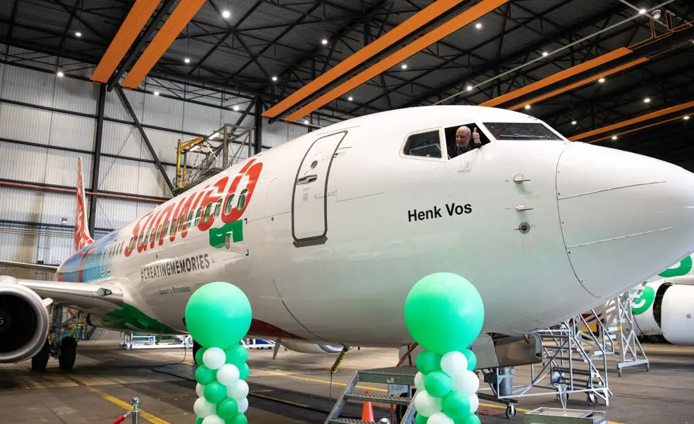 Op de neus van het vliegtuig prijkt ook de naam van een net gepensioneerde medewerker van Transavia. Pensionado Henk Vos wordt daarmee volgens Transavia bedankt voor zijn jarenlange inzet voor de intensieve samenwerking met Sunweb, waaronder het concept voor een ‘eigen’ vliegtuig van de reisorganisatie. Vos werkte 45 jaar voor Transavia.